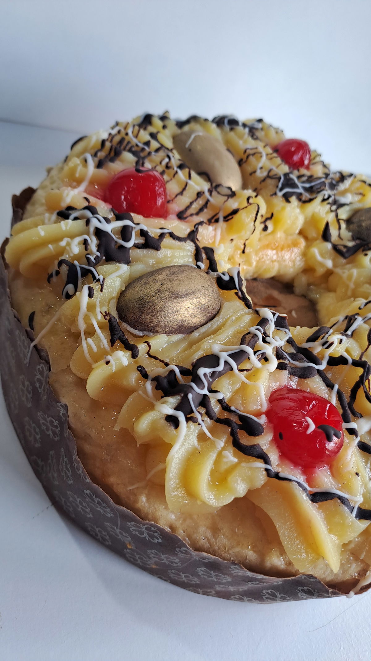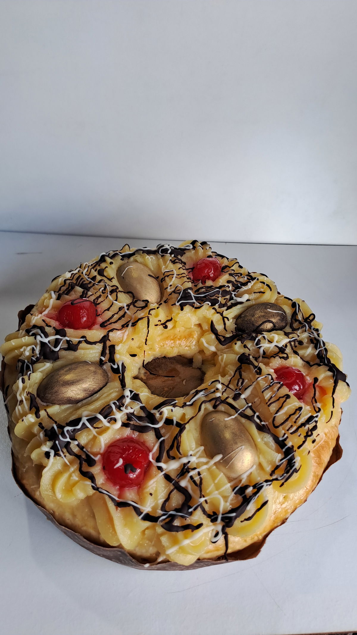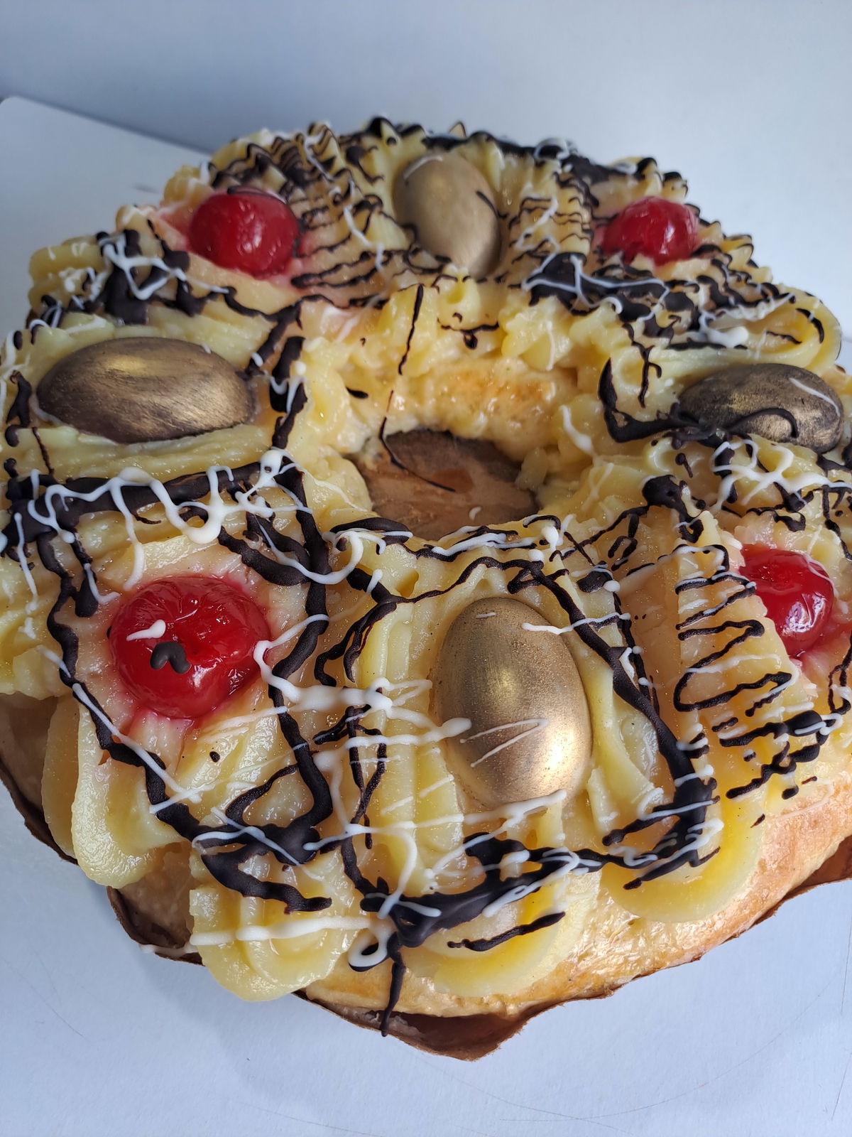 Rosca con crema pastelera, cerezas al marrasquino y medios huevitos de chocolate.
